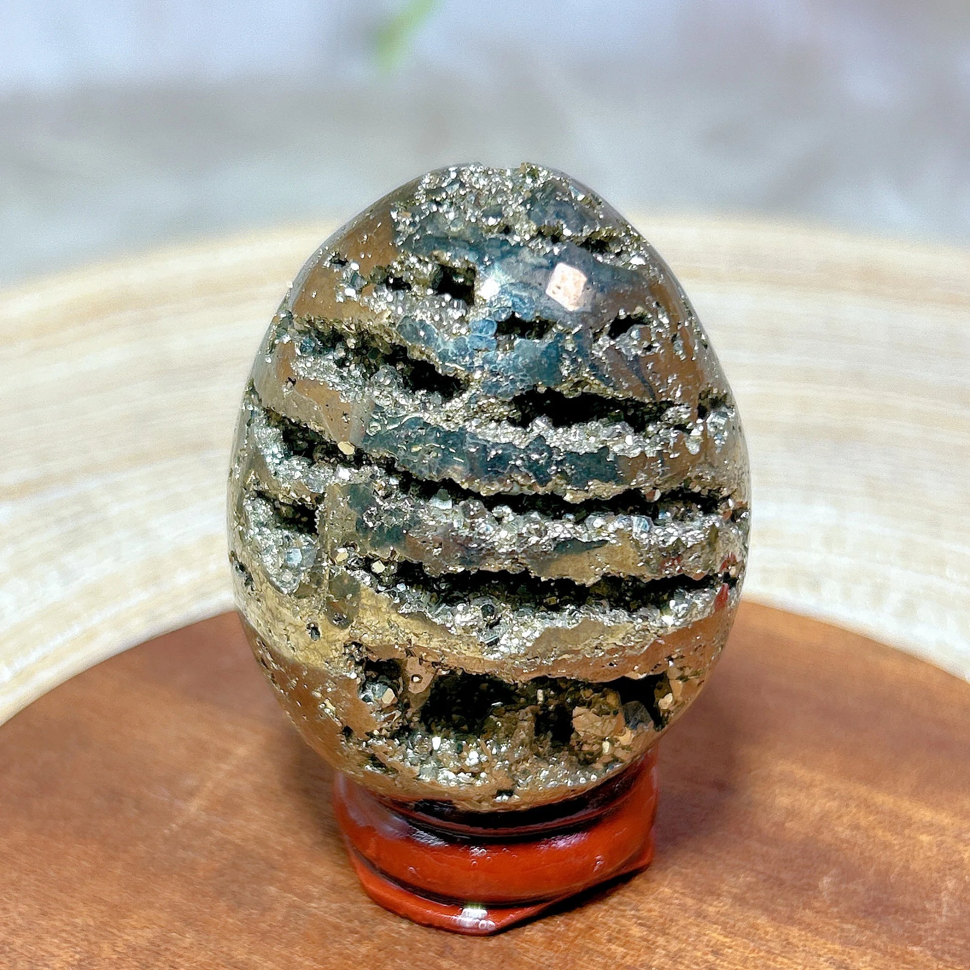 The polished egg shape paired with raw geode texture gives this pyrite piece a strong yet balanced presence.